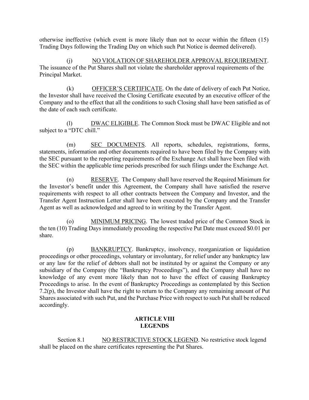 otherwise ineffective (which event is more likely than not to occur within the fifteen (15) Trading Days following the Trading Day on which such Put Notice is deemed delivered). (j) NO VIOLATION OF SHAREHOLDER APPROVAL REQUIREMENT. The issuance of the Put Shares shall not violate the shareholder approval requirements of the Principal Market. (k) OFFICER’S CERTIFICATE. On the date of delivery of each Put Notice, the Investor shall have received the Closing Certificate executed by an executive officer of the Company and to the effect that all the conditions to such Closing shall have been satisfied as of the date of each such certificate. (l) DWAC ELIGIBLE. The Common Stock must be DWAC Eligible and not subject to a “DTC chill.” (m) SEC DOCUMENTS. All reports, schedules, registrations, forms, statements, information and other documents required to have been filed by the Company with the SEC pursuant to the reporting requirements of the Exchange Act shall have been filed with the SEC within the applicable time periods prescribed for such filings under the Exchange Act. (n) RESERVE. The Company shall have reserved the Required Minimum for the Investor’s benefit under this Agreement, the Company shall have satisfied the reserve requirements with respect to all other contracts between the Company and Investor, and the Transfer Agent Instruction Letter shall have been executed by the Company and the Transfer Agent as well as acknowledged and agreed to in writing by the Transfer Agent. (o) MINIMUM PRICING. The lowest traded price of the Common Stock in the ten (10) Trading Days immediately preceding the respective Put Date must exceed $0.01 per share. (p) BANKRUPTCY. Bankruptcy, insolvency, reorganization or liquidation proceedings or other proceedings, voluntary or involuntary, for relief under any bankruptcy law or any law for the relief of debtors shall not be instituted by or against the Company or any subsidiary of the Company (the “Bankruptcy Proceedings”), and the Company shall have no knowledge of any event more likely than not to have the effect of causing Bankruptcy Proceedings to arise. In the event of Bankruptcy Proceedings as contemplated by this Section 7.2(p), the Investor shall have the right to return to the Company any remaining amount of Put Shares associated with such Put, and the Purchase Price with respect to such Put shall be reduced accordingly. ARTICLE VIII LEGENDS Section 8.1 NO RESTRICTIVE STOCK LEGEND. No restrictive stock legend shall be placed on the share certificates representing the Put Shares.