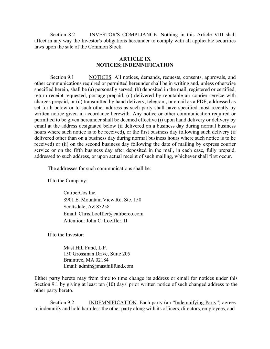 Section 8.2 INVESTOR'S COMPLIANCE. Nothing in this Article VIII shall affect in any way the Investor's obligations hereunder to comply with all applicable securities laws upon the sale of the Common Stock. ARTICLE IX NOTICES; INDEMNIFICATION Section 9.1 NOTICES. All notices, demands, requests, consents, approvals, and other communications required or permitted hereunder shall be in writing and, unless otherwise specified herein, shall be (a) personally served, (b) deposited in the mail, registered or certified, return receipt requested, postage prepaid, (c) delivered by reputable air courier service with charges prepaid, or (d) transmitted by hand delivery, telegram, or email as a PDF, addressed as set forth below or to such other address as such party shall have specified most recently by written notice given in accordance herewith. Any notice or other communication required or permitted to be given hereunder shall be deemed effective (i) upon hand delivery or delivery by email at the address designated below (if delivered on a business day during normal business hours where such notice is to be received), or the first business day following such delivery (if delivered other than on a business day during normal business hours where such notice is to be received) or (ii) on the second business day following the date of mailing by express courier service or on the fifth business day after deposited in the mail, in each case, fully prepaid, addressed to such address, or upon actual receipt of such mailing, whichever shall first occur. The addresses for such communications shall be: If to the Company: CaliberCos Inc. 8901 E. Mountain View Rd. Ste. 150 Scottsdale, AZ 85258 Email: Chris.Loeffler@caliberco.com Attention: John C. Loeffler, II If to the Investor: Mast Hill Fund, L.P. 150 Grossman Drive, Suite 205 Braintree, MA 02184 Email: admin@masthillfund.com Either party hereto may from time to time change its address or email for notices under this Section 9.1 by giving at least ten (10) days' prior written notice of such changed address to the other party hereto. Section 9.2 INDEMNIFICATION. Each party (an “Indemnifying Party”) agrees to indemnify and hold harmless the other party along with its officers, directors, employees, and