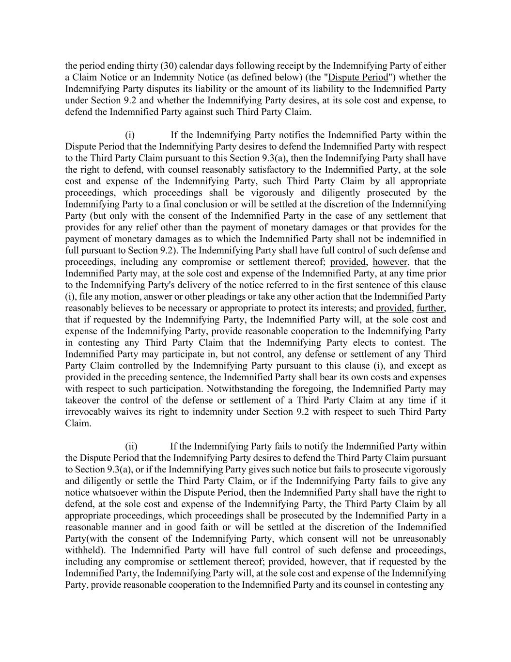 the period ending thirty (30) calendar days following receipt by the Indemnifying Party of either a Claim Notice or an Indemnity Notice (as defined below) (the "Dispute Period") whether the Indemnifying Party disputes its liability or the amount of its liability to the Indemnified Party under Section 9.2 and whether the Indemnifying Party desires, at its sole cost and expense, to defend the Indemnified Party against such Third Party Claim. (i) If the Indemnifying Party notifies the Indemnified Party within the Dispute Period that the Indemnifying Party desires to defend the Indemnified Party with respect to the Third Party Claim pursuant to this Section 9.3(a), then the Indemnifying Party shall have the right to defend, with counsel reasonably satisfactory to the Indemnified Party, at the sole cost and expense of the Indemnifying Party, such Third Party Claim by all appropriate proceedings, which proceedings shall be vigorously and diligently prosecuted by the Indemnifying Party to a final conclusion or will be settled at the discretion of the Indemnifying Party (but only with the consent of the Indemnified Party in the case of any settlement that provides for any relief other than the payment of monetary damages or that provides for the payment of monetary damages as to which the Indemnified Party shall not be indemnified in full pursuant to Section 9.2). The Indemnifying Party shall have full control of such defense and proceedings, including any compromise or settlement thereof; provided, however, that the Indemnified Party may, at the sole cost and expense of the Indemnified Party, at any time prior to the Indemnifying Party's delivery of the notice referred to in the first sentence of this clause (i), file any motion, answer or other pleadings or take any other action that the Indemnified Party reasonably believes to be necessary or appropriate to protect its interests; and provided, further, that if requested by the Indemnifying Party, the Indemnified Party will, at the sole cost and expense of the Indemnifying Party, provide reasonable cooperation to the Indemnifying Party in contesting any Third Party Claim that the Indemnifying Party elects to contest. The Indemnified Party may participate in, but not control, any defense or settlement of any Third Party Claim controlled by the Indemnifying Party pursuant to this clause (i), and except as provided in the preceding sentence, the Indemnified Party shall bear its own costs and expenses with respect to such participation. Notwithstanding the foregoing, the Indemnified Party may takeover the control of the defense or settlement of a Third Party Claim at any time if it irrevocably waives its right to indemnity under Section 9.2 with respect to such Third Party Claim. (ii) If the Indemnifying Party fails to notify the Indemnified Party within the Dispute Period that the Indemnifying Party desires to defend the Third Party Claim pursuant to Section 9.3(a), or if the Indemnifying Party gives such notice but fails to prosecute vigorously and diligently or settle the Third Party Claim, or if the Indemnifying Party fails to give any notice whatsoever within the Dispute Period, then the Indemnified Party shall have the right to defend, at the sole cost and expense of the Indemnifying Party, the Third Party Claim by all appropriate proceedings, which proceedings shall be prosecuted by the Indemnified Party in a reasonable manner and in good faith or will be settled at the discretion of the Indemnified Party(with the consent of the Indemnifying Party, which consent will not be unreasonably withheld). The Indemnified Party will have full control of such defense and proceedings, including any compromise or settlement thereof; provided, however, that if requested by the Indemnified Party, the Indemnifying Party will, at the sole cost and expense of the Indemnifying Party, provide reasonable cooperation to the Indemnified Party and its counsel in contesting any