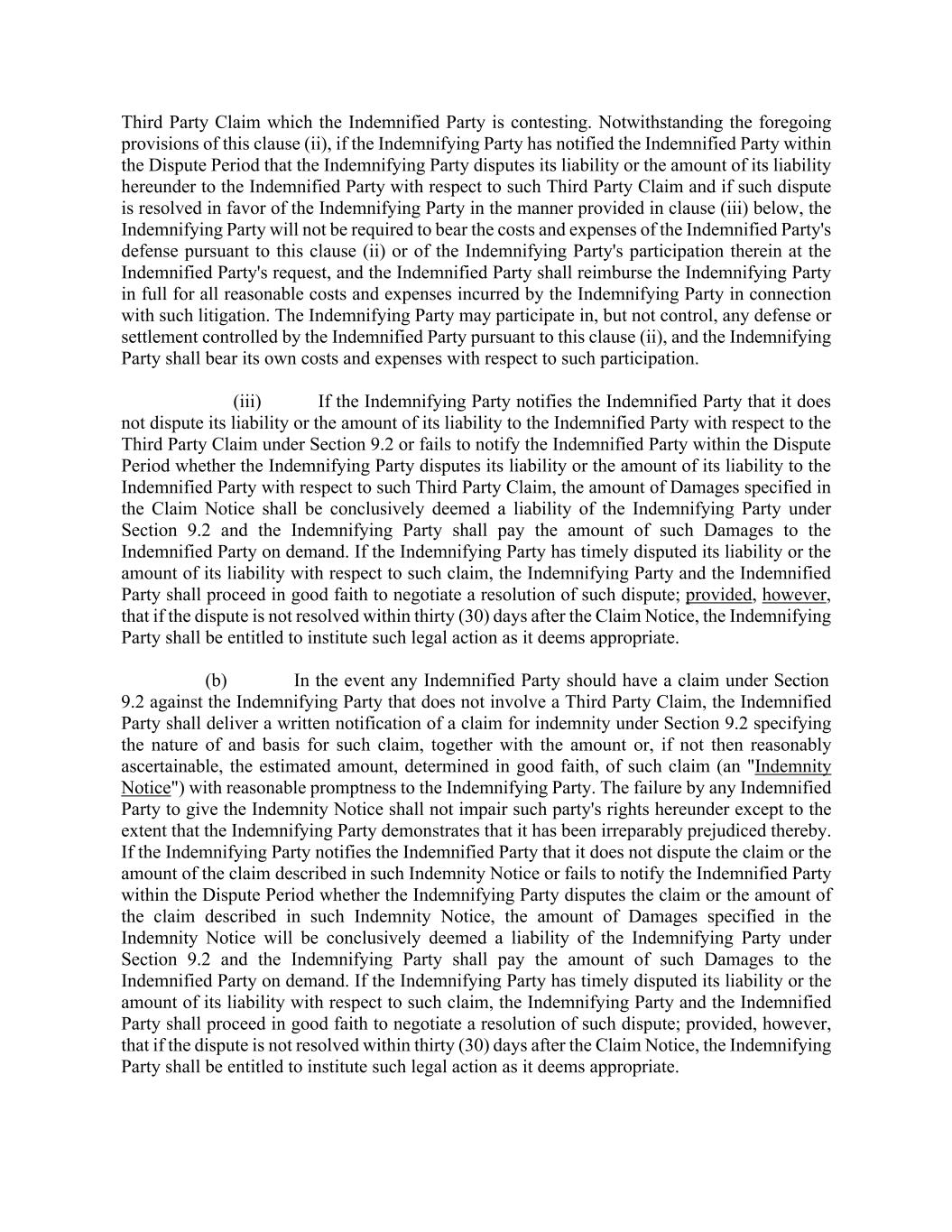 Third Party Claim which the Indemnified Party is contesting. Notwithstanding the foregoing provisions of this clause (ii), if the Indemnifying Party has notified the Indemnified Party within the Dispute Period that the Indemnifying Party disputes its liability or the amount of its liability hereunder to the Indemnified Party with respect to such Third Party Claim and if such dispute is resolved in favor of the Indemnifying Party in the manner provided in clause (iii) below, the Indemnifying Party will not be required to bear the costs and expenses of the Indemnified Party's defense pursuant to this clause (ii) or of the Indemnifying Party's participation therein at the Indemnified Party's request, and the Indemnified Party shall reimburse the Indemnifying Party in full for all reasonable costs and expenses incurred by the Indemnifying Party in connection with such litigation. The Indemnifying Party may participate in, but not control, any defense or settlement controlled by the Indemnified Party pursuant to this clause (ii), and the Indemnifying Party shall bear its own costs and expenses with respect to such participation. (iii) If the Indemnifying Party notifies the Indemnified Party that it does not dispute its liability or the amount of its liability to the Indemnified Party with respect to the Third Party Claim under Section 9.2 or fails to notify the Indemnified Party within the Dispute Period whether the Indemnifying Party disputes its liability or the amount of its liability to the Indemnified Party with respect to such Third Party Claim, the amount of Damages specified in the Claim Notice shall be conclusively deemed a liability of the Indemnifying Party under Section 9.2 and the Indemnifying Party shall pay the amount of such Damages to the Indemnified Party on demand. If the Indemnifying Party has timely disputed its liability or the amount of its liability with respect to such claim, the Indemnifying Party and the Indemnified Party shall proceed in good faith to negotiate a resolution of such dispute; provided, however, that if the dispute is not resolved within thirty (30) days after the Claim Notice, the Indemnifying Party shall be entitled to institute such legal action as it deems appropriate. (b) In the event any Indemnified Party should have a claim under Section 9.2 against the Indemnifying Party that does not involve a Third Party Claim, the Indemnified Party shall deliver a written notification of a claim for indemnity under Section 9.2 specifying the nature of and basis for such claim, together with the amount or, if not then reasonably ascertainable, the estimated amount, determined in good faith, of such claim (an "Indemnity Notice") with reasonable promptness to the Indemnifying Party. The failure by any Indemnified Party to give the Indemnity Notice shall not impair such party's rights hereunder except to the extent that the Indemnifying Party demonstrates that it has been irreparably prejudiced thereby. If the Indemnifying Party notifies the Indemnified Party that it does not dispute the claim or the amount of the claim described in such Indemnity Notice or fails to notify the Indemnified Party within the Dispute Period whether the Indemnifying Party disputes the claim or the amount of the claim described in such Indemnity Notice, the amount of Damages specified in the Indemnity Notice will be conclusively deemed a liability of the Indemnifying Party under Section 9.2 and the Indemnifying Party shall pay the amount of such Damages to the Indemnified Party on demand. If the Indemnifying Party has timely disputed its liability or the amount of its liability with respect to such claim, the Indemnifying Party and the Indemnified Party shall proceed in good faith to negotiate a resolution of such dispute; provided, however, that if the dispute is not resolved within thirty (30) days after the Claim Notice, the Indemnifying Party shall be entitled to institute such legal action as it deems appropriate.