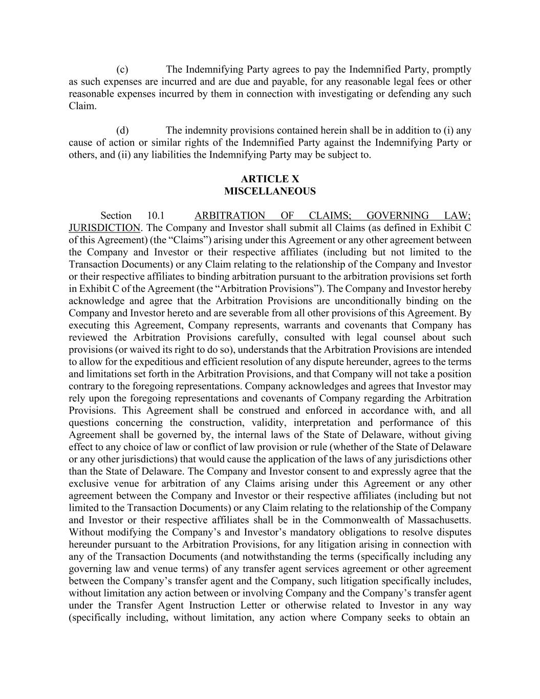(c) The Indemnifying Party agrees to pay the Indemnified Party, promptly as such expenses are incurred and are due and payable, for any reasonable legal fees or other reasonable expenses incurred by them in connection with investigating or defending any such Claim. (d) The indemnity provisions contained herein shall be in addition to (i) any cause of action or similar rights of the Indemnified Party against the Indemnifying Party or others, and (ii) any liabilities the Indemnifying Party may be subject to. ARTICLE X MISCELLANEOUS Section 10.1 ARBITRATION OF CLAIMS; GOVERNING LAW; JURISDICTION. The Company and Investor shall submit all Claims (as defined in Exhibit C of this Agreement) (the “Claims”) arising under this Agreement or any other agreement between the Company and Investor or their respective affiliates (including but not limited to the Transaction Documents) or any Claim relating to the relationship of the Company and Investor or their respective affiliates to binding arbitration pursuant to the arbitration provisions set forth in Exhibit C of the Agreement (the “Arbitration Provisions”). The Company and Investor hereby acknowledge and agree that the Arbitration Provisions are unconditionally binding on the Company and Investor hereto and are severable from all other provisions of this Agreement. By executing this Agreement, Company represents, warrants and covenants that Company has reviewed the Arbitration Provisions carefully, consulted with legal counsel about such provisions (or waived its right to do so), understands that the Arbitration Provisions are intended to allow for the expeditious and efficient resolution of any dispute hereunder, agrees to the terms and limitations set forth in the Arbitration Provisions, and that Company will not take a position contrary to the foregoing representations. Company acknowledges and agrees that Investor may rely upon the foregoing representations and covenants of Company regarding the Arbitration Provisions. This Agreement shall be construed and enforced in accordance with, and all questions concerning the construction, validity, interpretation and performance of this Agreement shall be governed by, the internal laws of the State of Delaware, without giving effect to any choice of law or conflict of law provision or rule (whether of the State of Delaware or any other jurisdictions) that would cause the application of the laws of any jurisdictions other than the State of Delaware. The Company and Investor consent to and expressly agree that the exclusive venue for arbitration of any Claims arising under this Agreement or any other agreement between the Company and Investor or their respective affiliates (including but not limited to the Transaction Documents) or any Claim relating to the relationship of the Company and Investor or their respective affiliates shall be in the Commonwealth of Massachusetts. Without modifying the Company’s and Investor’s mandatory obligations to resolve disputes hereunder pursuant to the Arbitration Provisions, for any litigation arising in connection with any of the Transaction Documents (and notwithstanding the terms (specifically including any governing law and venue terms) of any transfer agent services agreement or other agreement between the Company’s transfer agent and the Company, such litigation specifically includes, without limitation any action between or involving Company and the Company’s transfer agent under the Transfer Agent Instruction Letter or otherwise related to Investor in any way (specifically including, without limitation, any action where Company seeks to obtain an