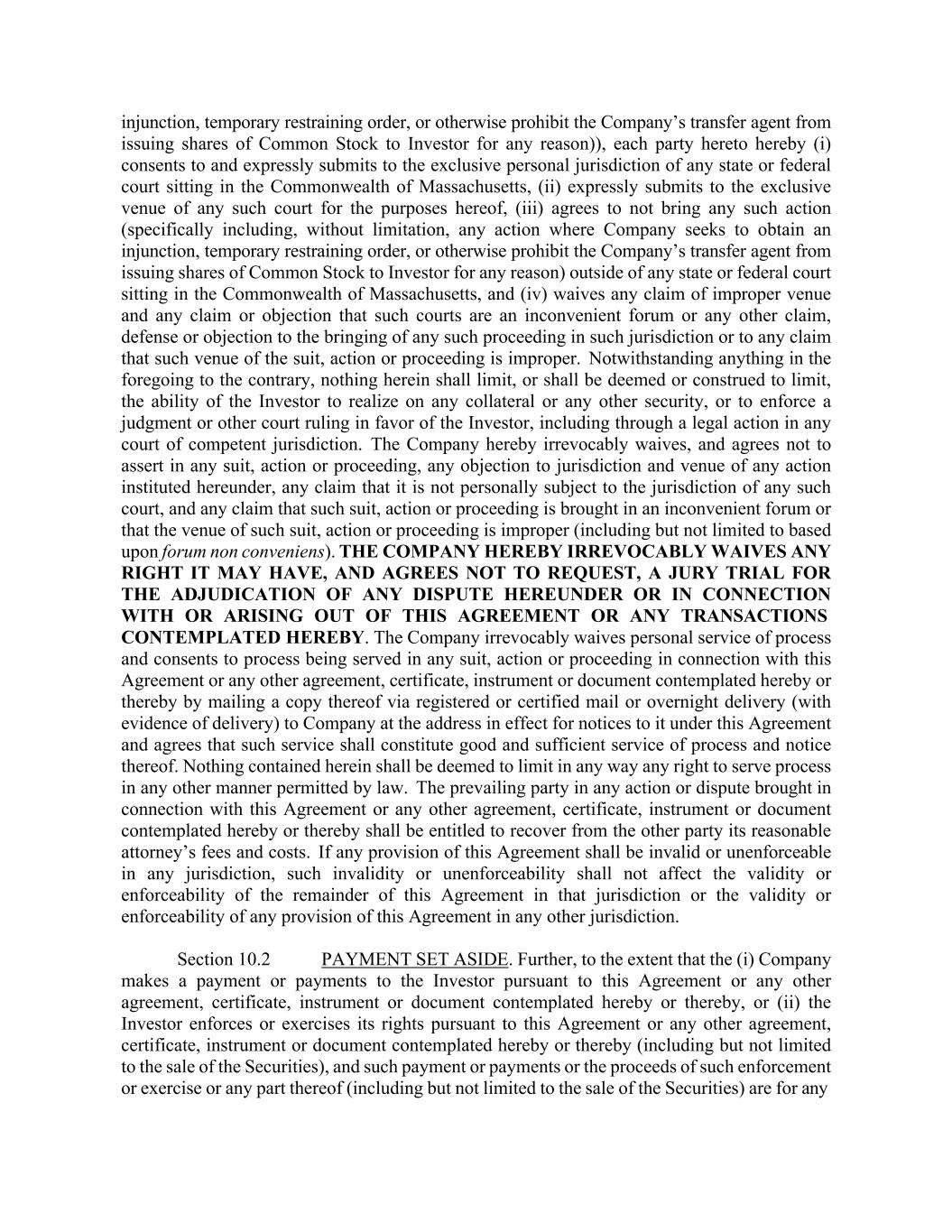 injunction, temporary restraining order, or otherwise prohibit the Company’s transfer agent from issuing shares of Common Stock to Investor for any reason)), each party hereto hereby (i) consents to and expressly submits to the exclusive personal jurisdiction of any state or federal court sitting in the Commonwealth of Massachusetts, (ii) expressly submits to the exclusive venue of any such court for the purposes hereof, (iii) agrees to not bring any such action (specifically including, without limitation, any action where Company seeks to obtain an injunction, temporary restraining order, or otherwise prohibit the Company’s transfer agent from issuing shares of Common Stock to Investor for any reason) outside of any state or federal court sitting in the Commonwealth of Massachusetts, and (iv) waives any claim of improper venue and any claim or objection that such courts are an inconvenient forum or any other claim, defense or objection to the bringing of any such proceeding in such jurisdiction or to any claim that such venue of the suit, action or proceeding is improper. Notwithstanding anything in the foregoing to the contrary, nothing herein shall limit, or shall be deemed or construed to limit, the ability of the Investor to realize on any collateral or any other security, or to enforce a judgment or other court ruling in favor of the Investor, including through a legal action in any court of competent jurisdiction. The Company hereby irrevocably waives, and agrees not to assert in any suit, action or proceeding, any objection to jurisdiction and venue of any action instituted hereunder, any claim that it is not personally subject to the jurisdiction of any such court, and any claim that such suit, action or proceeding is brought in an inconvenient forum or that the venue of such suit, action or proceeding is improper (including but not limited to based upon forum non conveniens). THE COMPANY HEREBY IRREVOCABLY WAIVES ANY RIGHT IT MAY HAVE, AND AGREES NOT TO REQUEST, A JURY TRIAL FOR THE ADJUDICATION OF ANY DISPUTE HEREUNDER OR IN CONNECTION WITH OR ARISING OUT OF THIS AGREEMENT OR ANY TRANSACTIONS CONTEMPLATED HEREBY. The Company irrevocably waives personal service of process and consents to process being served in any suit, action or proceeding in connection with this Agreement or any other agreement, certificate, instrument or document contemplated hereby or thereby by mailing a copy thereof via registered or certified mail or overnight delivery (with evidence of delivery) to Company at the address in effect for notices to it under this Agreement and agrees that such service shall constitute good and sufficient service of process and notice thereof. Nothing contained herein shall be deemed to limit in any way any right to serve process in any other manner permitted by law. The prevailing party in any action or dispute brought in connection with this Agreement or any other agreement, certificate, instrument or document contemplated hereby or thereby shall be entitled to recover from the other party its reasonable attorney’s fees and costs. If any provision of this Agreement shall be invalid or unenforceable in any jurisdiction, such invalidity or unenforceability shall not affect the validity or enforceability of the remainder of this Agreement in that jurisdiction or the validity or enforceability of any provision of this Agreement in any other jurisdiction. Section 10.2 PAYMENT SET ASIDE. Further, to the extent that the (i) Company makes a payment or payments to the Investor pursuant to this Agreement or any other agreement, certificate, instrument or document contemplated hereby or thereby, or (ii) the Investor enforces or exercises its rights pursuant to this Agreement or any other agreement, certificate, instrument or document contemplated hereby or thereby (including but not limited to the sale of the Securities), and such payment or payments or the proceeds of such enforcement or exercise or any part thereof (including but not limited to the sale of the Securities) are for any