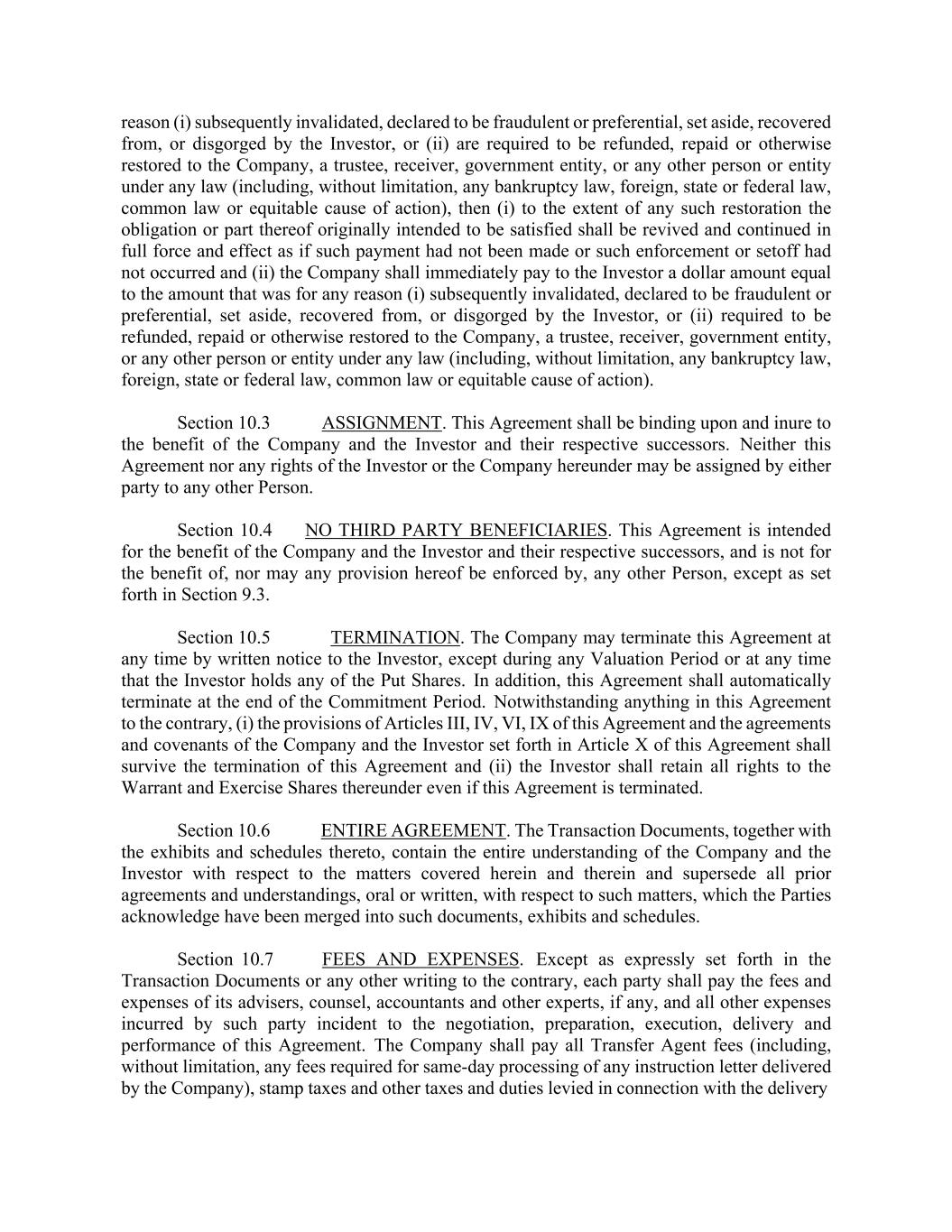 reason (i) subsequently invalidated, declared to be fraudulent or preferential, set aside, recovered from, or disgorged by the Investor, or (ii) are required to be refunded, repaid or otherwise restored to the Company, a trustee, receiver, government entity, or any other person or entity under any law (including, without limitation, any bankruptcy law, foreign, state or federal law, common law or equitable cause of action), then (i) to the extent of any such restoration the obligation or part thereof originally intended to be satisfied shall be revived and continued in full force and effect as if such payment had not been made or such enforcement or setoff had not occurred and (ii) the Company shall immediately pay to the Investor a dollar amount equal to the amount that was for any reason (i) subsequently invalidated, declared to be fraudulent or preferential, set aside, recovered from, or disgorged by the Investor, or (ii) required to be refunded, repaid or otherwise restored to the Company, a trustee, receiver, government entity, or any other person or entity under any law (including, without limitation, any bankruptcy law, foreign, state or federal law, common law or equitable cause of action). Section 10.3 ASSIGNMENT. This Agreement shall be binding upon and inure to the benefit of the Company and the Investor and their respective successors. Neither this Agreement nor any rights of the Investor or the Company hereunder may be assigned by either party to any other Person. Section 10.4 NO THIRD PARTY BENEFICIARIES. This Agreement is intended for the benefit of the Company and the Investor and their respective successors, and is not for the benefit of, nor may any provision hereof be enforced by, any other Person, except as set forth in Section 9.3. Section 10.5 TERMINATION. The Company may terminate this Agreement at any time by written notice to the Investor, except during any Valuation Period or at any time that the Investor holds any of the Put Shares. In addition, this Agreement shall automatically terminate at the end of the Commitment Period. Notwithstanding anything in this Agreement to the contrary, (i) the provisions of Articles III, IV, VI, IX of this Agreement and the agreements and covenants of the Company and the Investor set forth in Article X of this Agreement shall survive the termination of this Agreement and (ii) the Investor shall retain all rights to the Warrant and Exercise Shares thereunder even if this Agreement is terminated. Section 10.6 ENTIRE AGREEMENT. The Transaction Documents, together with the exhibits and schedules thereto, contain the entire understanding of the Company and the Investor with respect to the matters covered herein and therein and supersede all prior agreements and understandings, oral or written, with respect to such matters, which the Parties acknowledge have been merged into such documents, exhibits and schedules. Section 10.7 FEES AND EXPENSES. Except as expressly set forth in the Transaction Documents or any other writing to the contrary, each party shall pay the fees and expenses of its advisers, counsel, accountants and other experts, if any, and all other expenses incurred by such party incident to the negotiation, preparation, execution, delivery and performance of this Agreement. The Company shall pay all Transfer Agent fees (including, without limitation, any fees required for same-day processing of any instruction letter delivered by the Company), stamp taxes and other taxes and duties levied in connection with the delivery