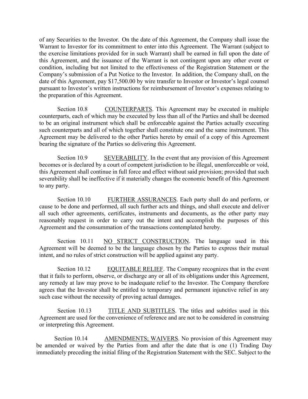 of any Securities to the Investor. On the date of this Agreement, the Company shall issue the Warrant to Investor for its commitment to enter into this Agreement. The Warrant (subject to the exercise limitations provided for in such Warrant) shall be earned in full upon the date of this Agreement, and the issuance of the Warrant is not contingent upon any other event or condition, including but not limited to the effectiveness of the Registration Statement or the Company’s submission of a Put Notice to the Investor. In addition, the Company shall, on the date of this Agreement, pay $17,500.00 by wire transfer to Investor or Investor’s legal counsel pursuant to Investor’s written instructions for reimbursement of Investor’s expenses relating to the preparation of this Agreement. Section 10.8 COUNTERPARTS. This Agreement may be executed in multiple counterparts, each of which may be executed by less than all of the Parties and shall be deemed to be an original instrument which shall be enforceable against the Parties actually executing such counterparts and all of which together shall constitute one and the same instrument. This Agreement may be delivered to the other Parties hereto by email of a copy of this Agreement bearing the signature of the Parties so delivering this Agreement. Section 10.9 SEVERABILITY. In the event that any provision of this Agreement becomes or is declared by a court of competent jurisdiction to be illegal, unenforceable or void, this Agreement shall continue in full force and effect without said provision; provided that such severability shall be ineffective if it materially changes the economic benefit of this Agreement to any party. Section 10.10 FURTHER ASSURANCES. Each party shall do and perform, or cause to be done and performed, all such further acts and things, and shall execute and deliver all such other agreements, certificates, instruments and documents, as the other party may reasonably request in order to carry out the intent and accomplish the purposes of this Agreement and the consummation of the transactions contemplated hereby. Section 10.11 NO STRICT CONSTRUCTION. The language used in this Agreement will be deemed to be the language chosen by the Parties to express their mutual intent, and no rules of strict construction will be applied against any party. Section 10.12 EQUITABLE RELIEF. The Company recognizes that in the event that it fails to perform, observe, or discharge any or all of its obligations under this Agreement, any remedy at law may prove to be inadequate relief to the Investor. The Company therefore agrees that the Investor shall be entitled to temporary and permanent injunctive relief in any such case without the necessity of proving actual damages. Section 10.13 TITLE AND SUBTITLES. The titles and subtitles used in this Agreement are used for the convenience of reference and are not to be considered in construing or interpreting this Agreement. Section 10.14 AMENDMENTS; WAIVERS. No provision of this Agreement may be amended or waived by the Parties from and after the date that is one (1) Trading Day immediately preceding the initial filing of the Registration Statement with the SEC. Subject to the