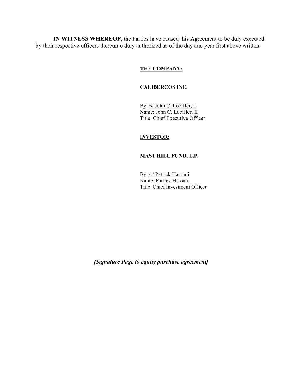 IN WITNESS WHEREOF, the Parties have caused this Agreement to be duly executed by their respective officers thereunto duly authorized as of the day and year first above written. THE COMPANY: CALIBERCOS INC. By: /s/ John C. Loeffler, II Name: John C. Loeffler, II Title: Chief Executive Officer INVESTOR: MAST HILL FUND, L.P. By: /s/ Patrick Hassani Name: Patrick Hassani Title: Chief Investment Officer [Signature Page to equity purchase agreement]