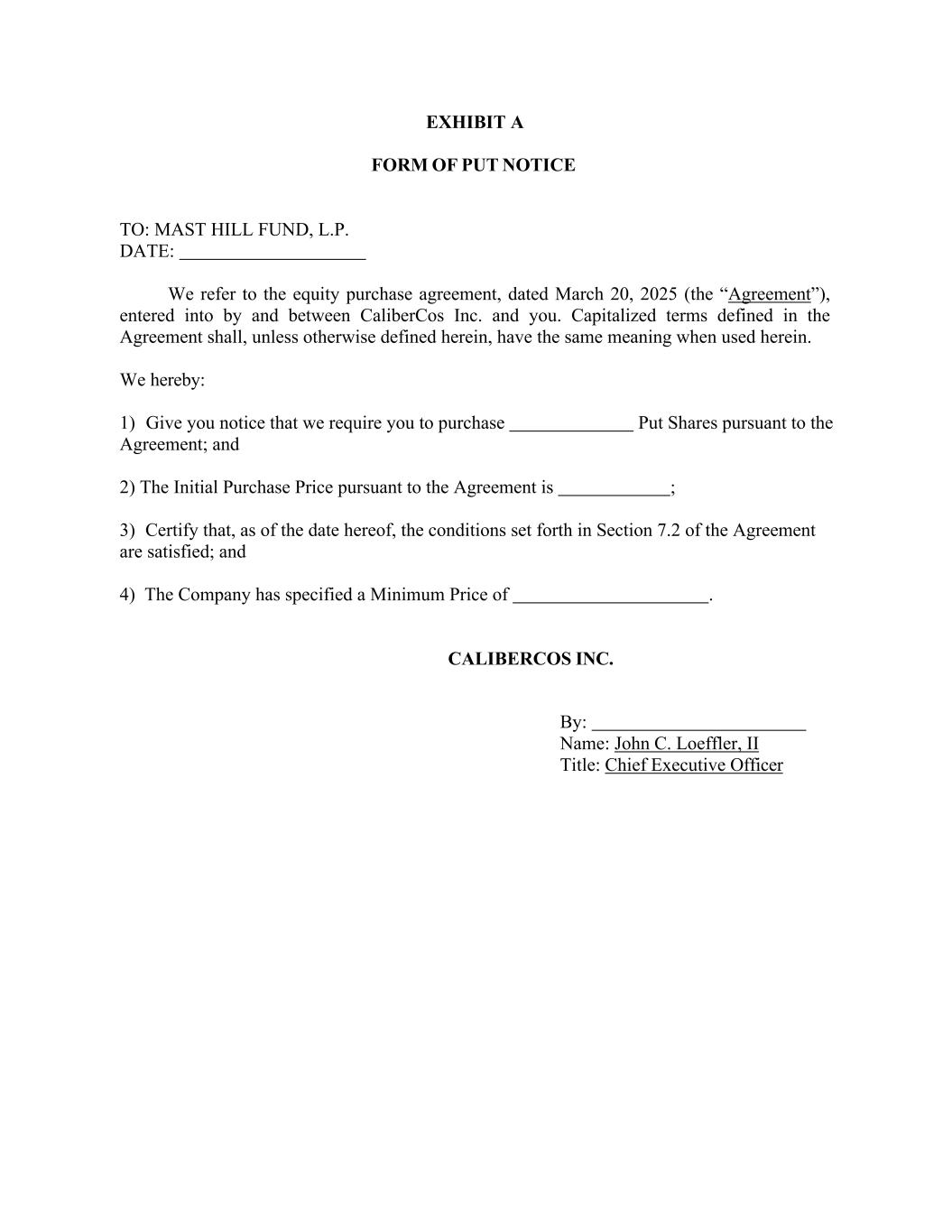 EXHIBIT A FORM OF PUT NOTICE TO: MAST HILL FUND, L.P. DATE: We refer to the equity purchase agreement, dated March 20, 2025 (the “Agreement”), entered into by and between CaliberCos Inc. and you. Capitalized terms defined in the Agreement shall, unless otherwise defined herein, have the same meaning when used herein. We hereby: 1) Give you notice that we require you to purchase Put Shares pursuant to the Agreement; and 2) The Initial Purchase Price pursuant to the Agreement is ; 3) Certify that, as of the date hereof, the conditions set forth in Section 7.2 of the Agreement are satisfied; and 4) The Company has specified a Minimum Price of . CALIBERCOS INC. By: Name: John C. Loeffler, II Title: Chief Executive Officer