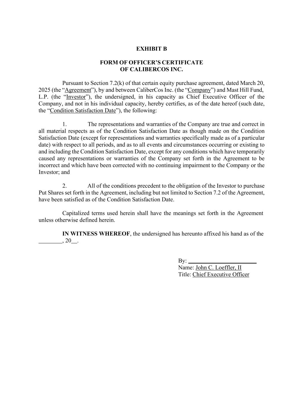 EXHIBIT B FORM OF OFFICER’S CERTIFICATE OF CALIBERCOS INC. Pursuant to Section 7.2(k) of that certain equity purchase agreement, dated March 20, 2025 (the “Agreement”), by and between CaliberCos Inc. (the “Company”) and Mast Hill Fund, L.P. (the “Investor”), the undersigned, in his capacity as Chief Executive Officer of the Company, and not in his individual capacity, hereby certifies, as of the date hereof (such date, the “Condition Satisfaction Date”), the following: 1. The representations and warranties of the Company are true and correct in all material respects as of the Condition Satisfaction Date as though made on the Condition Satisfaction Date (except for representations and warranties specifically made as of a particular date) with respect to all periods, and as to all events and circumstances occurring or existing to and including the Condition Satisfaction Date, except for any conditions which have temporarily caused any representations or warranties of the Company set forth in the Agreement to be incorrect and which have been corrected with no continuing impairment to the Company or the Investor; and 2. All of the conditions precedent to the obligation of the Investor to purchase Put Shares set forth in the Agreement, including but not limited to Section 7.2 of the Agreement, have been satisfied as of the Condition Satisfaction Date. Capitalized terms used herein shall have the meanings set forth in the Agreement unless otherwise defined herein. IN WITNESS WHEREOF, the undersigned has hereunto affixed his hand as of the , 20 . By: Name: John C. Loeffler, II Title: Chief Executive Officer