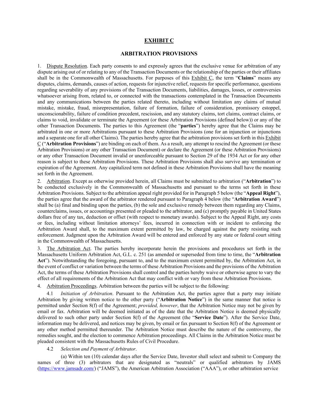 EXHIBIT C ARBITRATION PROVISIONS 1. Dispute Resolution. Each party consents to and expressly agrees that the exclusive venue for arbitration of any dispute arising out of or relating to any of the Transaction Documents or the relationship of the parties or their affiliates shall be in the Commonwealth of Massachusetts. For purposes of this Exhibit C, the term “Claims” means any disputes, claims, demands, causes of action, requests for injunctive relief, requests for specific performance, questions regarding severability of any provisions of the Transaction Documents, liabilities, damages, losses, or controversies whatsoever arising from, related to, or connected with the transactions contemplated in the Transaction Documents and any communications between the parties related thereto, including without limitation any claims of mutual mistake, mistake, fraud, misrepresentation, failure of formation, failure of consideration, promissory estoppel, unconscionability, failure of condition precedent, rescission, and any statutory claims, tort claims, contract claims, or claims to void, invalidate or terminate the Agreement (or these Arbitration Provisions (defined below)) or any of the other Transaction Documents. The parties to this Agreement (the “parties”) hereby agree that the Claims may be arbitrated in one or more Arbitrations pursuant to these Arbitration Provisions (one for an injunction or injunctions and a separate one for all other Claims). The parties hereby agree that the arbitration provisions set forth in this Exhibit C (“Arbitration Provisions”) are binding on each of them. As a result, any attempt to rescind the Agreement (or these Arbitration Provisions) or any other Transaction Document) or declare the Agreement (or these Arbitration Provisions) or any other Transaction Document invalid or unenforceable pursuant to Section 29 of the 1934 Act or for any other reason is subject to these Arbitration Provisions. These Arbitration Provisions shall also survive any termination or expiration of the Agreement. Any capitalized term not defined in these Arbitration Provisions shall have the meaning set forth in the Agreement. 2. Arbitration. Except as otherwise provided herein, all Claims must be submitted to arbitration (“Arbitration”) to be conducted exclusively in the Commonwealth of Massachusetts and pursuant to the terms set forth in these Arbitration Provisions. Subject to the arbitration appeal right provided for in Paragraph 5 below (the “Appeal Right”), the parties agree that the award of the arbitrator rendered pursuant to Paragraph 4 below (the “Arbitration Award”) shall be (a) final and binding upon the parties, (b) the sole and exclusive remedy between them regarding any Claims, counterclaims, issues, or accountings presented or pleaded to the arbitrator, and (c) promptly payable in United States dollars free of any tax, deduction or offset (with respect to monetary awards). Subject to the Appeal Right, any costs or fees, including without limitation attorneys’ fees, incurred in connection with or incident to enforcing the Arbitration Award shall, to the maximum extent permitted by law, be charged against the party resisting such enforcement. Judgment upon the Arbitration Award will be entered and enforced by any state or federal court sitting in the Commonwealth of Massachusetts. 3. The Arbitration Act. The parties hereby incorporate herein the provisions and procedures set forth in the Massachusetts Uniform Arbitration Act, G.L. c. 251 (as amended or superseded from time to time, the “Arbitration Act”). Notwithstanding the foregoing, pursuant to, and to the maximum extent permitted by, the Arbitration Act, in the event of conflict or variation between the terms of these Arbitration Provisions and the provisions of the Arbitration Act, the terms of these Arbitration Provisions shall control and the parties hereby waive or otherwise agree to vary the effect of all requirements of the Arbitration Act that may conflict with or vary from these Arbitration Provisions. 4. Arbitration Proceedings. Arbitration between the parties will be subject to the following: 4.1 Initiation of Arbitration. Pursuant to the Arbitration Act, the parties agree that a party may initiate Arbitration by giving written notice to the other party (“Arbitration Notice”) in the same manner that notice is permitted under Section 8(f) of the Agreement; provided, however, that the Arbitration Notice may not be given by email or fax. Arbitration will be deemed initiated as of the date that the Arbitration Notice is deemed physically delivered to such other party under Section 8(f) of the Agreement (the “Service Date”). After the Service Date, information may be delivered, and notices may be given, by email or fax pursuant to Section 8(f) of the Agreement or any other method permitted thereunder. The Arbitration Notice must describe the nature of the controversy, the remedies sought, and the election to commence Arbitration proceedings. All Claims in the Arbitration Notice must be pleaded consistent with the Massachusetts Rules of Civil Procedure. 4.2 Selection and Payment of Arbitrator. (a) Within ten (10) calendar days after the Service Date, Investor shall select and submit to Company the names of three (3) arbitrators that are designated as “neutrals” or qualified arbitrators by JAMS (https://www.jamsadr.com/) (“JAMS”), the American Arbitration Association (“AAA”), or other arbitration service