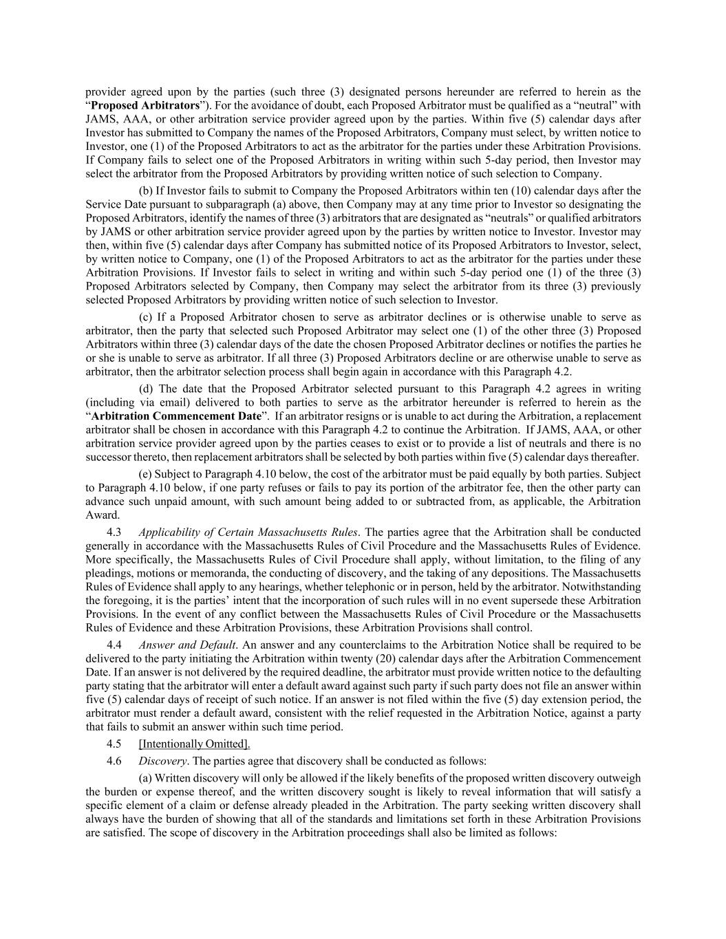 provider agreed upon by the parties (such three (3) designated persons hereunder are referred to herein as the “Proposed Arbitrators”). For the avoidance of doubt, each Proposed Arbitrator must be qualified as a “neutral” with JAMS, AAA, or other arbitration service provider agreed upon by the parties. Within five (5) calendar days after Investor has submitted to Company the names of the Proposed Arbitrators, Company must select, by written notice to Investor, one (1) of the Proposed Arbitrators to act as the arbitrator for the parties under these Arbitration Provisions. If Company fails to select one of the Proposed Arbitrators in writing within such 5-day period, then Investor may select the arbitrator from the Proposed Arbitrators by providing written notice of such selection to Company. (b) If Investor fails to submit to Company the Proposed Arbitrators within ten (10) calendar days after the Service Date pursuant to subparagraph (a) above, then Company may at any time prior to Investor so designating the Proposed Arbitrators, identify the names of three (3) arbitrators that are designated as “neutrals” or qualified arbitrators by JAMS or other arbitration service provider agreed upon by the parties by written notice to Investor. Investor may then, within five (5) calendar days after Company has submitted notice of its Proposed Arbitrators to Investor, select, by written notice to Company, one (1) of the Proposed Arbitrators to act as the arbitrator for the parties under these Arbitration Provisions. If Investor fails to select in writing and within such 5-day period one (1) of the three (3) Proposed Arbitrators selected by Company, then Company may select the arbitrator from its three (3) previously selected Proposed Arbitrators by providing written notice of such selection to Investor. (c) If a Proposed Arbitrator chosen to serve as arbitrator declines or is otherwise unable to serve as arbitrator, then the party that selected such Proposed Arbitrator may select one (1) of the other three (3) Proposed Arbitrators within three (3) calendar days of the date the chosen Proposed Arbitrator declines or notifies the parties he or she is unable to serve as arbitrator. If all three (3) Proposed Arbitrators decline or are otherwise unable to serve as arbitrator, then the arbitrator selection process shall begin again in accordance with this Paragraph 4.2. (d) The date that the Proposed Arbitrator selected pursuant to this Paragraph 4.2 agrees in writing (including via email) delivered to both parties to serve as the arbitrator hereunder is referred to herein as the “Arbitration Commencement Date”. If an arbitrator resigns or is unable to act during the Arbitration, a replacement arbitrator shall be chosen in accordance with this Paragraph 4.2 to continue the Arbitration. If JAMS, AAA, or other arbitration service provider agreed upon by the parties ceases to exist or to provide a list of neutrals and there is no successor thereto, then replacement arbitrators shall be selected by both parties within five (5) calendar days thereafter. (e) Subject to Paragraph 4.10 below, the cost of the arbitrator must be paid equally by both parties. Subject to Paragraph 4.10 below, if one party refuses or fails to pay its portion of the arbitrator fee, then the other party can advance such unpaid amount, with such amount being added to or subtracted from, as applicable, the Arbitration Award. 4.3 Applicability of Certain Massachusetts Rules. The parties agree that the Arbitration shall be conducted generally in accordance with the Massachusetts Rules of Civil Procedure and the Massachusetts Rules of Evidence. More specifically, the Massachusetts Rules of Civil Procedure shall apply, without limitation, to the filing of any pleadings, motions or memoranda, the conducting of discovery, and the taking of any depositions. The Massachusetts Rules of Evidence shall apply to any hearings, whether telephonic or in person, held by the arbitrator. Notwithstanding the foregoing, it is the parties’ intent that the incorporation of such rules will in no event supersede these Arbitration Provisions. In the event of any conflict between the Massachusetts Rules of Civil Procedure or the Massachusetts Rules of Evidence and these Arbitration Provisions, these Arbitration Provisions shall control. 4.4 Answer and Default. An answer and any counterclaims to the Arbitration Notice shall be required to be delivered to the party initiating the Arbitration within twenty (20) calendar days after the Arbitration Commencement Date. If an answer is not delivered by the required deadline, the arbitrator must provide written notice to the defaulting party stating that the arbitrator will enter a default award against such party if such party does not file an answer within five (5) calendar days of receipt of such notice. If an answer is not filed within the five (5) day extension period, the arbitrator must render a default award, consistent with the relief requested in the Arbitration Notice, against a party that fails to submit an answer within such time period. 4.5 [Intentionally Omitted]. 4.6 Discovery. The parties agree that discovery shall be conducted as follows: (a) Written discovery will only be allowed if the likely benefits of the proposed written discovery outweigh the burden or expense thereof, and the written discovery sought is likely to reveal information that will satisfy a specific element of a claim or defense already pleaded in the Arbitration. The party seeking written discovery shall always have the burden of showing that all of the standards and limitations set forth in these Arbitration Provisions are satisfied. The scope of discovery in the Arbitration proceedings shall also be limited as follows: