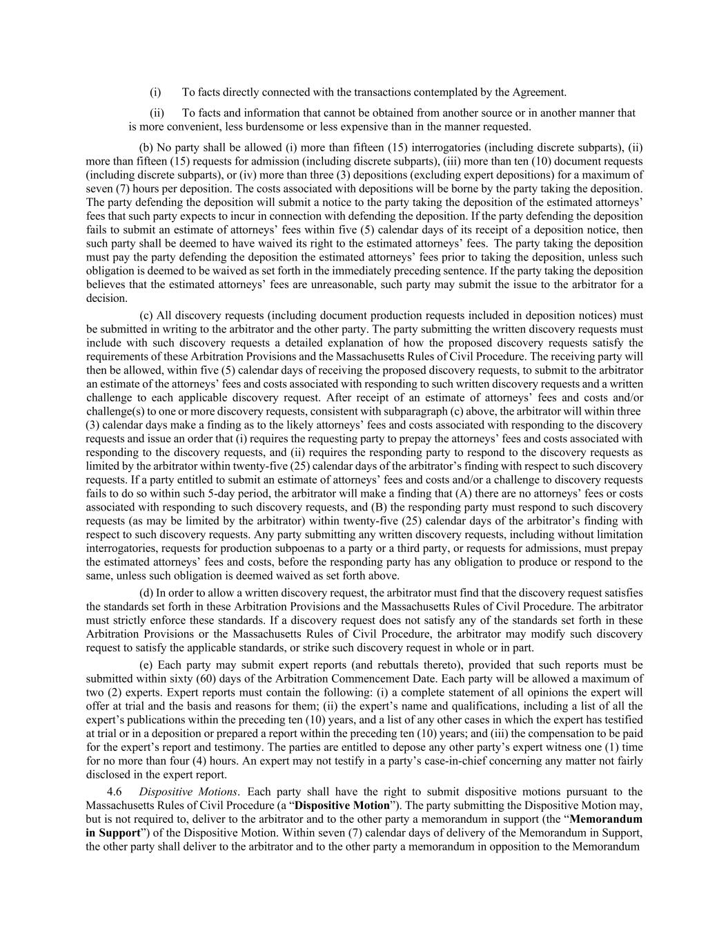 (i) To facts directly connected with the transactions contemplated by the Agreement. (ii) To facts and information that cannot be obtained from another source or in another manner that is more convenient, less burdensome or less expensive than in the manner requested. (b) No party shall be allowed (i) more than fifteen (15) interrogatories (including discrete subparts), (ii) more than fifteen (15) requests for admission (including discrete subparts), (iii) more than ten (10) document requests (including discrete subparts), or (iv) more than three (3) depositions (excluding expert depositions) for a maximum of seven (7) hours per deposition. The costs associated with depositions will be borne by the party taking the deposition. The party defending the deposition will submit a notice to the party taking the deposition of the estimated attorneys’ fees that such party expects to incur in connection with defending the deposition. If the party defending the deposition fails to submit an estimate of attorneys’ fees within five (5) calendar days of its receipt of a deposition notice, then such party shall be deemed to have waived its right to the estimated attorneys’ fees. The party taking the deposition must pay the party defending the deposition the estimated attorneys’ fees prior to taking the deposition, unless such obligation is deemed to be waived as set forth in the immediately preceding sentence. If the party taking the deposition believes that the estimated attorneys’ fees are unreasonable, such party may submit the issue to the arbitrator for a decision. (c) All discovery requests (including document production requests included in deposition notices) must be submitted in writing to the arbitrator and the other party. The party submitting the written discovery requests must include with such discovery requests a detailed explanation of how the proposed discovery requests satisfy the requirements of these Arbitration Provisions and the Massachusetts Rules of Civil Procedure. The receiving party will then be allowed, within five (5) calendar days of receiving the proposed discovery requests, to submit to the arbitrator an estimate of the attorneys’ fees and costs associated with responding to such written discovery requests and a written challenge to each applicable discovery request. After receipt of an estimate of attorneys’ fees and costs and/or challenge(s) to one or more discovery requests, consistent with subparagraph (c) above, the arbitrator will within three (3) calendar days make a finding as to the likely attorneys’ fees and costs associated with responding to the discovery requests and issue an order that (i) requires the requesting party to prepay the attorneys’ fees and costs associated with responding to the discovery requests, and (ii) requires the responding party to respond to the discovery requests as limited by the arbitrator within twenty-five (25) calendar days of the arbitrator’s finding with respect to such discovery requests. If a party entitled to submit an estimate of attorneys’ fees and costs and/or a challenge to discovery requests fails to do so within such 5-day period, the arbitrator will make a finding that (A) there are no attorneys’ fees or costs associated with responding to such discovery requests, and (B) the responding party must respond to such discovery requests (as may be limited by the arbitrator) within twenty-five (25) calendar days of the arbitrator’s finding with respect to such discovery requests. Any party submitting any written discovery requests, including without limitation interrogatories, requests for production subpoenas to a party or a third party, or requests for admissions, must prepay the estimated attorneys’ fees and costs, before the responding party has any obligation to produce or respond to the same, unless such obligation is deemed waived as set forth above. (d) In order to allow a written discovery request, the arbitrator must find that the discovery request satisfies the standards set forth in these Arbitration Provisions and the Massachusetts Rules of Civil Procedure. The arbitrator must strictly enforce these standards. If a discovery request does not satisfy any of the standards set forth in these Arbitration Provisions or the Massachusetts Rules of Civil Procedure, the arbitrator may modify such discovery request to satisfy the applicable standards, or strike such discovery request in whole or in part. (e) Each party may submit expert reports (and rebuttals thereto), provided that such reports must be submitted within sixty (60) days of the Arbitration Commencement Date. Each party will be allowed a maximum of two (2) experts. Expert reports must contain the following: (i) a complete statement of all opinions the expert will offer at trial and the basis and reasons for them; (ii) the expert’s name and qualifications, including a list of all the expert’s publications within the preceding ten (10) years, and a list of any other cases in which the expert has testified at trial or in a deposition or prepared a report within the preceding ten (10) years; and (iii) the compensation to be paid for the expert’s report and testimony. The parties are entitled to depose any other party’s expert witness one (1) time for no more than four (4) hours. An expert may not testify in a party’s case-in-chief concerning any matter not fairly disclosed in the expert report. 4.6 Dispositive Motions. Each party shall have the right to submit dispositive motions pursuant to the Massachusetts Rules of Civil Procedure (a “Dispositive Motion”). The party submitting the Dispositive Motion may, but is not required to, deliver to the arbitrator and to the other party a memorandum in support (the “Memorandum in Support”) of the Dispositive Motion. Within seven (7) calendar days of delivery of the Memorandum in Support, the other party shall deliver to the arbitrator and to the other party a memorandum in