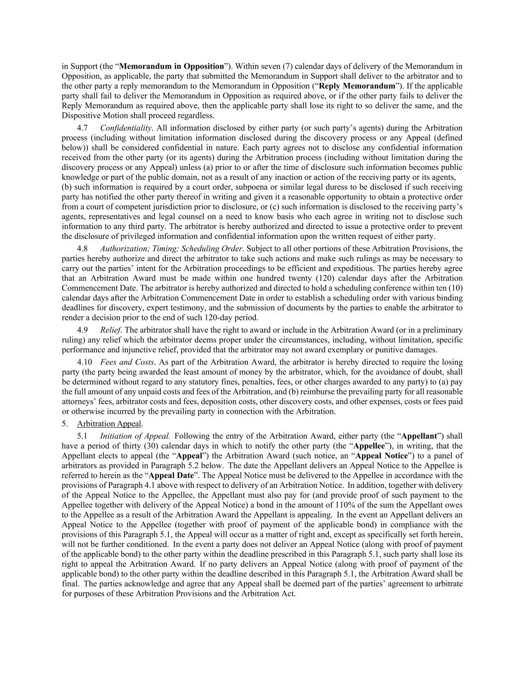 in Support (the “Memorandum in Opposition”). Within seven (7) calendar days of delivery of the Memorandum in Opposition, as applicable, the party that submitted the Memorandum in Support shall deliver to the arbitrator and to the other party a reply memorandum to the Memorandum in Opposition (“Reply Memorandum”). If the applicable party shall fail to deliver the Memorandum in Opposition as required above, or if the other party fails to deliver the Reply Memorandum as required above, then the applicable party shall lose its right to so deliver the same, and the Dispositive Motion shall proceed regardless. 4.7 Confidentiality. All information disclosed by either party (or such party’s agents) during the Arbitration process (including without limitation information disclosed during the discovery process or any Appeal (defined below)) shall be considered confidential in nature. Each party agrees not to disclose any confidential information received from the other party (or its agents) during the Arbitration process (including without limitation during the discovery process or any Appeal) unless (a) prior to or after the time of disclosure such information becomes public knowledge or part of the public domain, not as a result of any inaction or action of the receiving party or its agents, (b) such information is required by a court order, subpoena or similar legal duress to be disclosed if such receiving party has notified the other party thereof in writing and given it a reasonable opportunity to obtain a protective order from a court of competent jurisdiction prior to disclosure, or (c) such information is disclosed to the receiving party’s agents, representatives and legal counsel on a need to know basis who each agree in writing not to disclose such information to any third party. The arbitrator is hereby authorized and directed to issue a protective order to prevent the disclosure of privileged information and confidential information upon the written request of either party. 4.8 Authorization; Timing; Scheduling Order. Subject to all other portions of these Arbitration Provisions, the parties hereby authorize and direct the arbitrator to take such actions and make such rulings as may be necessary to carry out the parties’ intent for the Arbitration proceedings to be efficient and expeditious. The parties hereby agree that an Arbitration Award must be made within one hundred twenty (120) calendar days after the Arbitration Commencement Date. The arbitrator is hereby authorized and directed to hold a scheduling conference within ten (10) calendar days after the Arbitration Commencement Date in order to establish a scheduling order with various binding deadlines for discovery, expert testimony, and the submission of documents by the parties to enable the arbitrator to render a decision prior to the end of such 120-day period. 4.9 Relief. The arbitrator shall have the right to award or include in the Arbitration Award (or in a preliminary ruling) any relief which the arbitrator deems proper under the circumstances, including, without limitation, specific performance and injunctive relief, provided that the arbitrator may not award exemplary or punitive damages. 4.10 Fees and Costs. As part of the Arbitration Award, the arbitrator is hereby directed to require the losing party (the party being awarded the least amount of money by the arbitrator, which, for the avoidance of doubt, shall be determined without regard to any statutory fines, penalties, fees, or other charges awarded to any party) to (a) pay the full amount of any unpaid costs and fees of the Arbitration, and (b) reimburse the prevailing party for all reasonable attorneys’ fees, arbitrator costs and fees, deposition costs, other discovery costs, and other expenses, costs or fees paid or otherwise incurred by the prevailing party in connection with the Arbitration. 5. Arbitration Appeal. 5.1 Initiation of Appeal. Following the entry of the Arbitration Award, either party (the “Appellant”) shall have a period of thirty (30) calendar days in which to notify the other party (the “Appellee”), in writing, that the Appellant elects to appeal (the “Appeal”) the Arbitration Award (such notice, an “Appeal Notice”) to a panel of arbitrators as provided in Paragraph 5.2 below. The date the Appellant delivers an Appeal Notice to the Appellee is referred to herein as the “Appeal Date”. The Appeal Notice must be delivered to the Appellee in accordance with the provisions of Paragraph 4.1 above with respect to delivery of an Arbitration Notice. In addition, together with delivery of the Appeal Notice to the Appellee, the Appellant must also pay for (and provide proof of such payment to the Appellee together with delivery of the Appeal Notice) a bond in the amount of 110% of the sum the Appellant owes to the Appellee as a result of the Arbitration Award the Appellant is appealing. In the event an Appellant delivers an Appeal Notice to the Appellee (together with proof of payment of the applicable bond) in compliance with the provisions of this Paragraph 5.1, the Appeal will occur as a matter of right and, except as specifically set forth herein, will not be further conditioned. In the event a party does not deliver an Appeal Notice (along with proof of payment of the applicable bond) to the other party within the deadline prescribed in this Paragraph 5.1, such party shall lose its right to appeal the Arbitration Award. If no party delivers an Appeal Notice (along with proof of payment of the applicable bond) to the other party within the deadline described in this Paragraph 5.1, the Arbitration Award shall be final. The parties acknowledge and agree that any Appeal shall be deemed part of the parties’ agreement to arbitrate for purposes of these Arbitration Provisions and the Arbitration Act.