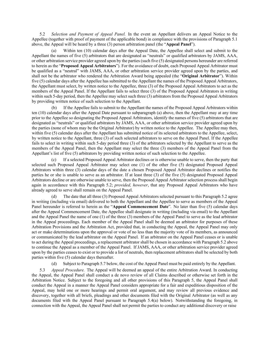 5.2 Selection and Payment of Appeal Panel. In the event an Appellant delivers an Appeal Notice to the Appellee (together with proof of payment of the applicable bond) in compliance with the provisions of Paragraph 5.1 above, the Appeal will be heard by a three (3) person arbitration panel (the “Appeal Panel”). (a) Within ten (10) calendar days after the Appeal Date, the Appellee shall select and submit to the Appellant the names of five (5) arbitrators that are designated as “neutrals” or qualified arbitrators by JAMS, AAA, or other arbitration service provider agreed upon by the parties (such five (5) designated persons hereunder are referred to herein as the “Proposed Appeal Arbitrators”). For the avoidance of doubt, each Proposed Appeal Arbitrator must be qualified as a “neutral” with JAMS, AAA, or other arbitration service provider agreed upon by the parties, and shall not be the arbitrator who rendered the Arbitration Award being appealed (the “Original Arbitrator”). Within five (5) calendar days after the Appellee has submitted to the Appellant the names of the Proposed Appeal Arbitrators, the Appellant must select, by written notice to the Appellee, three (3) of the Proposed Appeal Arbitrators to act as the members of the Appeal Panel. If the Appellant fails to select three (3) of the Proposed Appeal Arbitrators in writing within such 5-day period, then the Appellee may select such three (3) arbitrators from the Proposed Appeal Arbitrators by providing written notice of such selection to the Appellant. (b) If the Appellee fails to submit to the Appellant the names of the Proposed Appeal Arbitrators within ten (10) calendar days after the Appeal Date pursuant to subparagraph (a) above, then the Appellant may at any time prior to the Appellee so designating the Proposed Appeal Arbitrators, identify the names of five (5) arbitrators that are designated as “neutrals” or qualified arbitrators by JAMS, AAA, or other arbitration service provider agreed upon by the parties (none of whom may be the Original Arbitrator) by written notice to the Appellee. The Appellee may then, within five (5) calendar days after the Appellant has submitted notice of its selected arbitrators to the Appellee, select, by written notice to the Appellant, three (3) of such selected arbitrators to serve on the Appeal Panel. If the Appellee fails to select in writing within such 5-day period three (3) of the arbitrators selected by the Appellant to serve as the members of the Appeal Panel, then the Appellant may select the three (3) members of the Appeal Panel from the Appellant’s list of five (5) arbitrators by providing written notice of such selection to the Appellee. (c) If a selected Proposed Appeal Arbitrator declines or is otherwise unable to serve, then the party that selected such Proposed Appeal Arbitrator may select one (1) of the other five (5) designated Proposed Appeal Arbitrators within three (3) calendar days of the date a chosen Proposed Appeal Arbitrator declines or notifies the parties he or she is unable to serve as an arbitrator. If at least three (3) of the five (5) designated Proposed Appeal Arbitrators decline or are otherwise unable to serve, then the Proposed Appeal Arbitrator selection process shall begin again in accordance with this Paragraph 5.2; provided, however, that any Proposed Appeal Arbitrators who have already agreed to serve shall remain on the Appeal Panel. (d) The date that all three (3) Proposed Appeal Arbitrators selected pursuant to this Paragraph 5.2 agree in writing (including via email) delivered to both the Appellant and the Appellee to serve as members of the Appeal Panel hereunder is referred to herein as the “Appeal Commencement Date”. No later than five (5) calendar days after the Appeal Commencement Date, the Appellee shall designate in writing (including via email) to the Appellant and the Appeal Panel the name of one (1) of the three (3) members of the Appeal Panel to serve as the lead arbitrator in the Appeal proceedings. Each member of the Appeal Panel shall be deemed an arbitrator for purposes of these Arbitration Provisions and the Arbitration Act, provided that, in conducting the Appeal, the Appeal Panel may only act or make determinations upon the approval or vote of no less than the majority vote of its members, as announced or communicated by the lead arbitrator on the Appeal Panel. If an arbitrator on the Appeal Panel ceases or is unable to act during the Appeal proceedings, a replacement arbitrator shall be chosen in accordance with Paragraph 5.2 above to continue the Appeal as a member of the Appeal Panel. If JAMS, AAA, or other arbitration service provider agreed upon by the parties ceases to exist or to provide a list of neutrals, then replacement arbitrators shall be selected by both parties within five (5) calendar days thereafter. (d) Subject to Paragraph 5.7 below, the cost of the Appeal Panel must be paid entirely by the Appellant. 5.3 Appeal Procedure. The Appeal will be deemed an appeal of the entire Arbitration Award. In conducting the Appeal, the Appeal Panel shall conduct a de novo review of all Claims described or otherwise set forth in the Arbitration Notice. Subject to the foregoing and all other provisions of this Paragraph 5, the Appeal Panel shall conduct the Appeal in a manner the Appeal Panel considers appropriate for a fair and expeditious disposition of the Appeal, may hold one or more hearings and permit oral argument, and may review all previous evidence and discovery, together with all briefs, pleadings and other documents filed with the Original Arbitrator (as well as any documents filed with the Appeal Panel pursuant to Paragraph 5.4(a) below). Notwithstanding the foregoing, in connection with the Appeal, the Appeal Panel shall not permit the parties to conduct any additional discovery or raise
