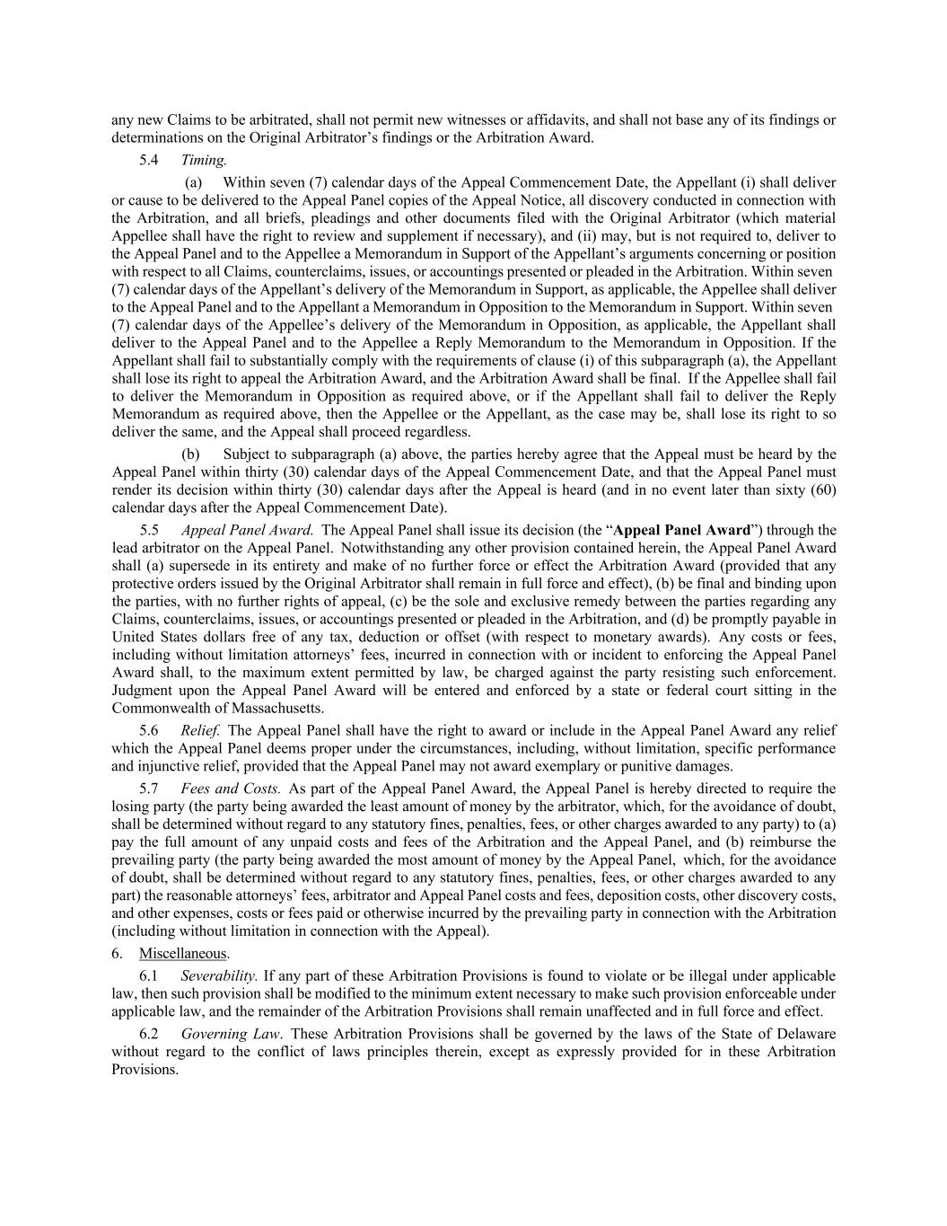 any new Claims to be arbitrated, shall not permit new witnesses or affidavits, and shall not base any of its findings or determinations on the Original Arbitrator’s findings or the Arbitration Award. 5.4 Timing. (a) Within seven (7) calendar days of the Appeal Commencement Date, the Appellant (i) shall deliver or cause to be delivered to the Appeal Panel copies of the Appeal Notice, all discovery conducted in connection with the Arbitration, and all briefs, pleadings and other documents filed with the Original Arbitrator (which material Appellee shall have the right to review and supplement if necessary), and (ii) may, but is not required to, deliver to the Appeal Panel and to the Appellee a Memorandum in Support of the Appellant’s arguments concerning or position with respect to all Claims, counterclaims, issues, or accountings presented or pleaded in the Arbitration. Within seven (7) calendar days of the Appellant’s delivery of the Memorandum in Support, as applicable, the Appellee shall deliver to the Appeal Panel and to the Appellant a Memorandum in Opposition to the Memorandum in Support. Within seven (7) calendar days of the Appellee’s delivery of the Memorandum in Opposition, as applicable, the Appellant shall deliver to the Appeal Panel and to the Appellee a Reply Memorandum to the Memorandum in Opposition. If the Appellant shall fail to substantially comply with the requirements of clause (i) of this subparagraph (a), the Appellant shall lose its right to appeal the Arbitration Award, and the Arbitration Award shall be final. If the Appellee shall fail to deliver the Memorandum in Opposition as required above, or if the Appellant shall fail to deliver the Reply Memorandum as required above, then the Appellee or the Appellant, as the case may be, shall lose its right to so deliver the same, and the Appeal shall proceed regardless. (b) Subject to subparagraph (a) above, the parties hereby agree that the Appeal must be heard by the Appeal Panel within thirty (30) calendar days of the Appeal Commencement Date, and that the Appeal Panel must render its decision within thirty (30) calendar days after the Appeal is heard (and in no event later than sixty (60) calendar days after the Appeal Commencement Date). 5.5 Appeal Panel Award. The Appeal Panel shall issue its decision (the “Appeal Panel Award”) through the lead arbitrator on the Appeal Panel. Notwithstanding any other provision contained herein, the Appeal Panel Award shall (a) supersede in its entirety and make of no further force or effect the Arbitration Award (provided that any protective orders issued by the Original Arbitrator shall remain in full force and effect), (b) be final and binding upon the parties, with no further rights of appeal, (c) be the sole and exclusive remedy between the parties regarding any Claims, counterclaims, issues, or accountings presented or pleaded in the Arbitration, and (d) be promptly payable in United States dollars free of any tax, deduction or offset (with respect to monetary awards). Any costs or fees, including without limitation attorneys’ fees, incurred in connection with or incident to enforcing the Appeal Panel Award shall, to the maximum extent permitted by law, be charged against the party resisting such enforcement. Judgment upon the Appeal Panel Award will be entered and enforced by a state or federal court sitting in the Commonwealth of Massachusetts. 5.6 Relief. The Appeal Panel shall have the right to award or include in the Appeal Panel Award any relief which the Appeal Panel deems proper under the circumstances, including, without limitation, specific performance and injunctive relief, provided that the Appeal Panel may not award exemplary or punitive damages. 5.7 Fees and Costs. As part of the Appeal Panel Award, the Appeal Panel is hereby directed to require the losing party (the party being awarded the least amount of money by the arbitrator, which, for the avoidance of doubt, shall be determined without regard to any statutory fines, penalties, fees, or other charges awarded to any party) to (a) pay the full amount of any unpaid costs and fees of the Arbitration and the Appeal Panel, and (b) reimburse the prevailing party (the party being awarded the most amount of money by the Appeal Panel, which, for the avoidance of doubt, shall be determined without regard to any statutory fines, penalties, fees, or other charges awarded to any part) the reasonable attorneys’ fees, arbitrator and Appeal Panel costs and fees, deposition costs, other discovery costs, and other expenses, costs or fees paid or otherwise incurred by the prevailing party in connection with the Arbitration (including without limitation in connection with the Appeal). 6. Miscellaneous. 6.1 Severability. If any part of these Arbitration Provisions is found to violate or be illegal under applicable law, then such provision shall be modified to the minimum extent necessary to make such provision enforceable under applicable law, and the remainder of the Arbitration Provisions shall remain unaffected and in full force and effect. 6.2 Governing Law. These Arbitration Provisions shall be governed by the laws of the State of Delaware without regard to the conflict of laws principles therein, except as expressly provided for in these Arbitration Provisions.