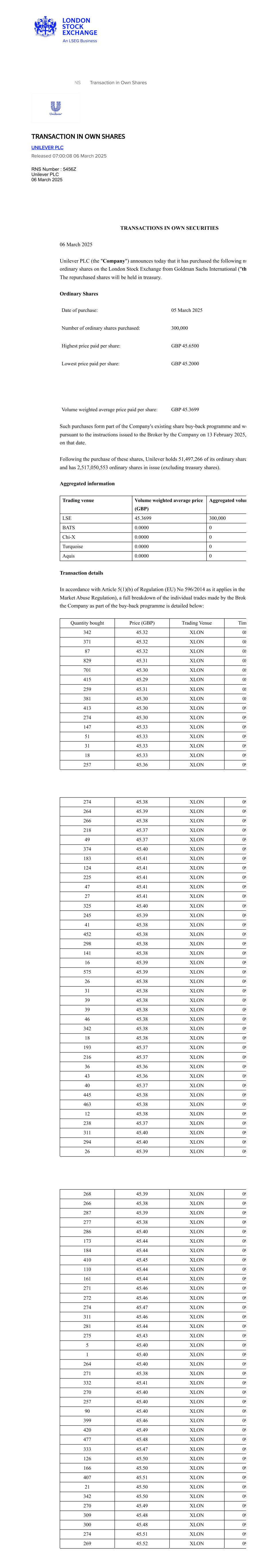 RNS Transaction in Own Shares TRANSACTION IN OWN SHARES UNILEVER PLC Released 07:00:08 06 March 2025 RNS Number : 5456Z Unilever PLC 06 March 2025 TRANSACTIONS IN OWN SECURITIES 06 March 2025 Unilever PLC (the "Company") announces today that it has purchased the following nu ordinary shares on the London Stock Exchange from Goldman Sachs International ("th The repurchased shares will be held in treasury. Ordinary Shares Date of purchase: 05 March 2025 Number of ordinary shares purchased: 300,000 Highest price paid per share: GBP 45.6500 Lowest price paid per share: GBP 45.2000 Volume weighted average price paid per share: GBP 45.3699 Such purchases form part of the Company's existing share buy-back programme and we pursuant to the instructions issued to the Broker by the Company on 13 February 2025, on that date. Following the purchase of these shares, Unilever holds 51,497,266 of its ordinary share and has 2,517,050,553 ordinary shares in issue (excluding treasury shares). Aggregated information Trading venue Volume weighted average price (GBP) Aggregated volum LSE 45.3699 300,000 BATS 0.0000 0 Chi-X 0.0000 0 Turquoise 0.0000 0 Aquis 0.0000 0 Transaction details In accordance with Article 5(1)(b) of Regulation (EU) No 596/2014 as it applies in the Market Abuse Regulation), a full breakdown of the individual trades made by the Broke the Company as part of the buy-back programme is detailed below: Quantity bought Price (GBP) Trading Venue Tim 342 45.32 XLON 08 371 45.32 XLON 08 87 45.32 XLON 08 829 45.31 XLON 08 701 45.30 XLON 08 415 45.29 XLON 08 259 45.31 XLON 08 381 45.30 XLON 08 413 45.30 XLON 09 274 45.30 XLON 09 147 45.33 XLON 09 51 45.33 XLON 09 31 45.33 XLON 09 18 45.33 XLON 09 257 45.36 XLON 09 274 45.38 XLON 09 264 45.39 XLON 09 266 45.38 XLON 09 218 45.37 XLON 09 49 45.37 XLON 09 374 45.40 XLON 09 183 45.41 XLON 09 124 45.41 XLON 09 225 45.41 XLON 09 47 45.41 XLON 09 27 45.41 XLON 09 325 45.40 XLON 09 245 45.39 XLON 09 41 45.38 XLON 09 452 45.38 XLON 09 298 45.38 XLON 09 141 45.38 XLON 09 16 45.39 XLON 09 575 45.39 XLON 09 26 45.38 XLON 09 31 45.38 XLON 09 39 45.38 XLON 09 39 45.38 XLON 09 46 45.38 XLON 09 342 45.38 XLON 09 18 45.38 XLON 09 193 45.37 XLON 09 216 45.37 XLON 09 36 45.36 XLON 09 43 45.36 XLON 09 40 45.37 XLON 09 445 45.38 XLON 09 463 45.38 XLON 09 12 45.38 XLON 09 238 45.37 XLON 09 311 45.40 XLON 09 294 45.40 XLON 09 26 45.39 XLON 09 268 45.39 XLON 09 266 45.38 XLON 09 287 45.39 XLON 09 277 45.38 XLON 09 286 45.40 XLON 09 173 45.44 XLON 09 184 45.44 XLON 09 410 45.45 XLON 09 110 45.44 XLON 09 161 45.44 XLON 09 271 45.46 XLON 09 272 45.46 XLON 09 274 45.47 XLON 09 311 45.46 XLON 09 281 45.44 XLON 09 275 45.43 XLON 09 5 45.40 XLON 09 1 45.40 XLON 09 264 45.40 XLON 09 271 45.38 XLON 09 332 45.41 XLON 09 270 45.40 XLON 09 257 45.40 XLON 09 90 45.40 XLON 09 399 45.46 XLON 09 420 45.49 XLON 09 477 45.48 XLON 09 333 45.47 XLON 09 126 45.50 XLON 09 166 45.50 XLON 09 407 45.51 XLON 09 21 45.50 XLON 09 342 45.50 XLON 09 270 45.49 XLON 09 309 45.48 XLON 09 300 45.48 XLON 09 274 45.51 XLON 09 269 45.52 XLON 09