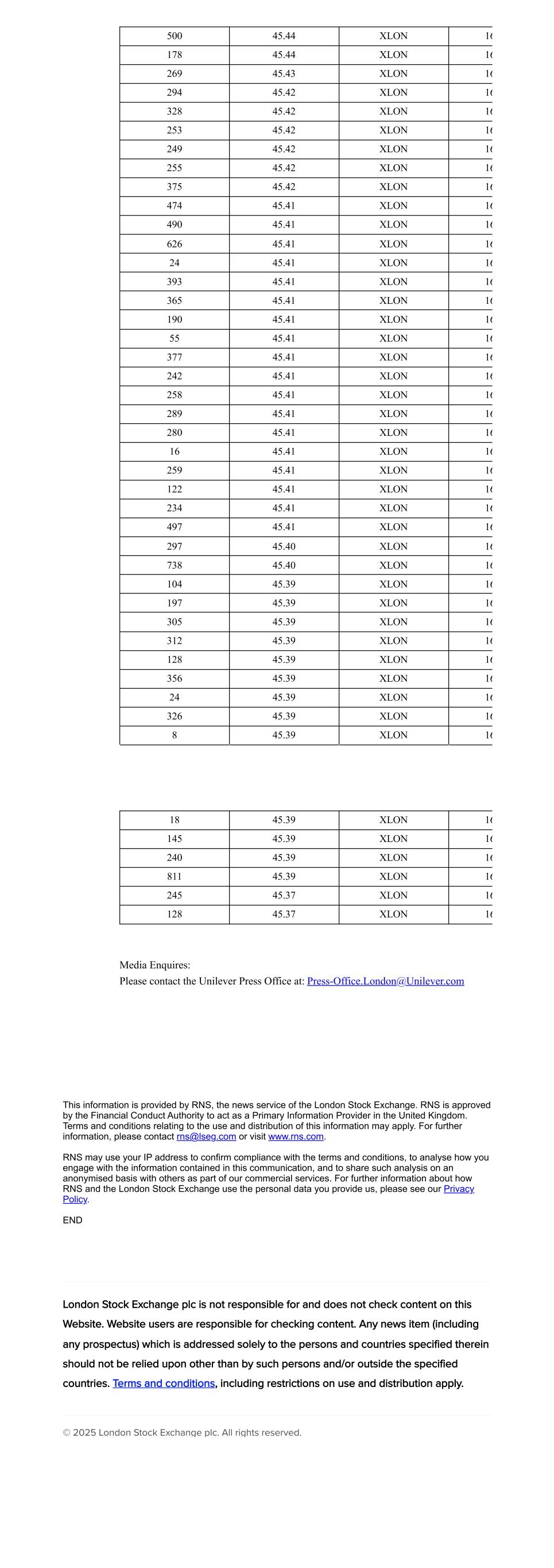 500 45.44 XLON 16 178 45.44 XLON 16 269 45.43 XLON 16 294 45.42 XLON 16 328 45.42 XLON 16 253 45.42 XLON 16 249 45.42 XLON 16 255 45.42 XLON 16 375 45.42 XLON 16 474 45.41 XLON 16 490 45.41 XLON 16 626 45.41 XLON 16 24 45.41 XLON 16 393 45.41 XLON 16 365 45.41 XLON 16 190 45.41 XLON 16 55 45.41 XLON 16 377 45.41 XLON 16 242 45.41 XLON 16 258 45.41 XLON 16 289 45.41 XLON 16 280 45.41 XLON 16 16 45.41 XLON 16 259 45.41 XLON 16 122 45.41 XLON 16 234 45.41 XLON 16 497 45.41 XLON 16 297 45.40 XLON 16 738 45.40 XLON 16 104 45.39 XLON 16 197 45.39 XLON 16 305 45.39 XLON 16 312 45.39 XLON 16 128 45.39 XLON 16 356 45.39 XLON 16 24 45.39 XLON 16 326 45.39 XLON 16 8 45.39 XLON 16 18 45.39 XLON 16 145 45.39 XLON 16 240 45.39 XLON 16 811 45.39 XLON 16 245 45.37 XLON 16 128 45.37 XLON 16 Media Enquires: Please contact the Unilever Press Office at: Press-Office.London@Unilever.com This information is provided by RNS, the news service of the London Stock Exchange. RNS is approved by the Financial Conduct Authority to act as a Primary Information Provider in the United Kingdom. Terms and conditions relating to the use and distribution of this information may apply. For further information, please contact rns@lseg.com or visit www.rns.com. RNS may use your IP address to confirm compliance with the terms and conditions, to analyse how you engage with the information contained in this communication, and to share such analysis on an anonymised basis with others as part of our commercial services. For further information about how RNS and the London Stock Exchange use the personal data you provide us, please see our Privacy Policy. END London Stock Exchange plc is not responsible for and does not check content on this Website. Website users are responsible for checking content. Any news item (including any prospectus) which is addressed solely to the persons and countries specified therein should not be relied upon other than by such persons and/or outside the specified countries. Terms and conditions, including restrictions on use and distribution apply. © 2025 London Stock Exchange plc. All rights reserved.