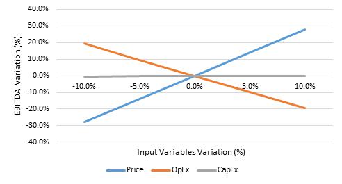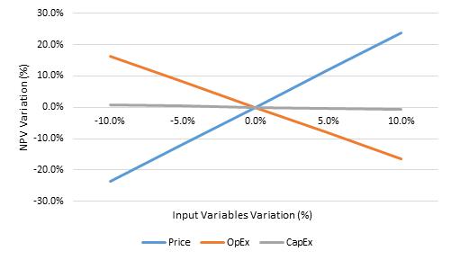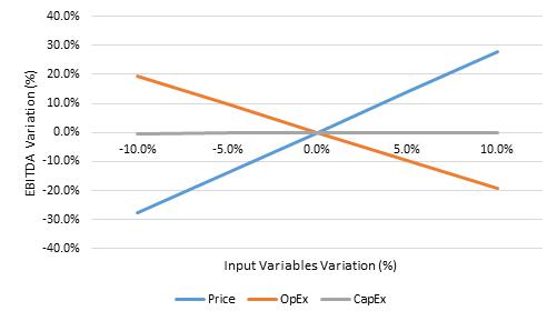 Tables 41 and 42 detail the sensitivity of the EBITDA and NPV to each variable, respectively. Figures 17 and 18 show the results of the sensitivity of NPV and EBITDA, respectively, to the three variables.
