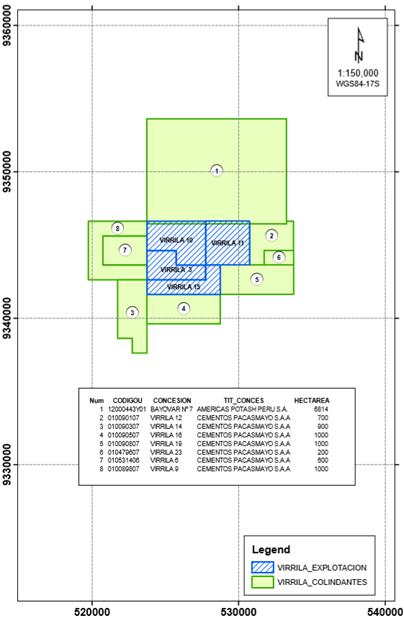 The information in this chapter was obtained from the competent authority Instituto Geológico, Minero Metalúrgico (INGEMMET). Figure 19 shows adjacent mineral concessions. To the north of the Cementos Pacasmayo S.A.A., concession is the Bayovar N° 7 concession owned by Americas Potash Peru S.A. To the east of the concession are concessions Virrila 12, Virrila 19, and Virrila 23, owned by Cementos Pacasmayo S.A.A. To the west are concessions Virrila 6, Virrila 9 and Virrila 14 owned by Cementos Pacasmayo S.A.A. and to the north is the Virrila 16 concession owned by Cementos Pacasmayo S.A.A.