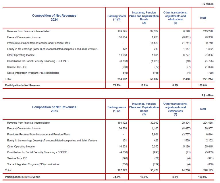 The main assumptions of the segment for income and expenses include: (i) the excess of cash held by insurance, private pensions and capitalization, which are included in this segment, resulting in an increase in net revenue interest; (ii) wages and benefits and administrative costs included within the insurance segment, pension plans and capitalization, which consist only of costs associated directly with these operations; and (iii) the costs incurred in the banking segment, related to the infrastructure of the branch network and other overhead, that are not allocated.