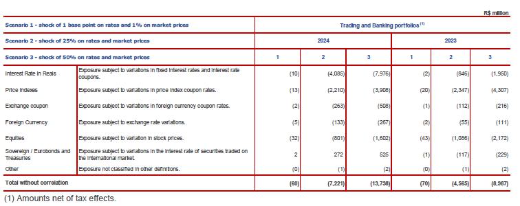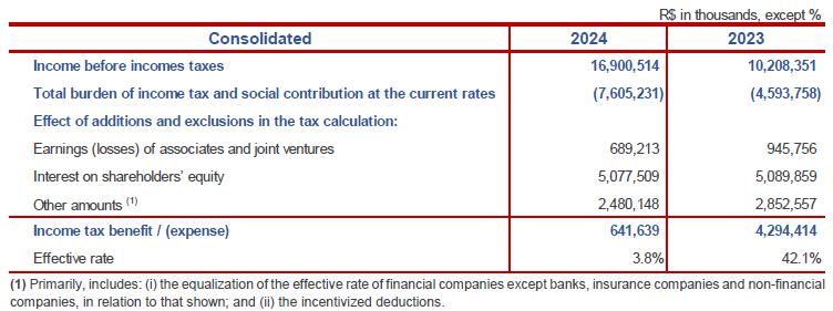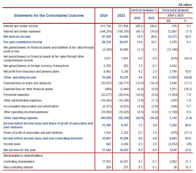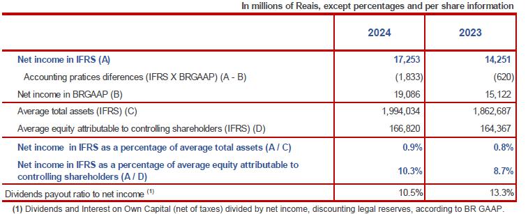 (1) They refer to: adjustments of consolidation, originating from proportionally consolidated companies (Grupo Cielo, Grupo Alelo, etc.) for management purposes; (2) Adjustments of consolidation originating from the “non-consolidation” of exclusive funds; (3) Adjustments due to the differences of the accounting standards used in the management reports and in the Financial Statements of the Organization that were prepared in the IFRS. The main adjustments refer to the impairment of loans and advances, effective interest rate and business combinations; (4) It includes, in the Consolidated IFRS, the balances related to “Net gains/(losses) on financial assets and liabilities at fair value through income”, “Net gains/(losses) on financial assets at fair value through other comprehensive income” and “Net gains/(losses) on foreign currency transactions”; and (5) It includes, in the Consolidated IFRS, the balances referring to depreciation and amortization.
