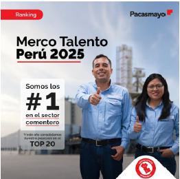 For the second consecutive year, Cementos Pacasmayo is ranked among the Top 20 in the Merco Talento general ranking. This recognition reaffirms our commitment to the development, well-being, and retention of our people. |