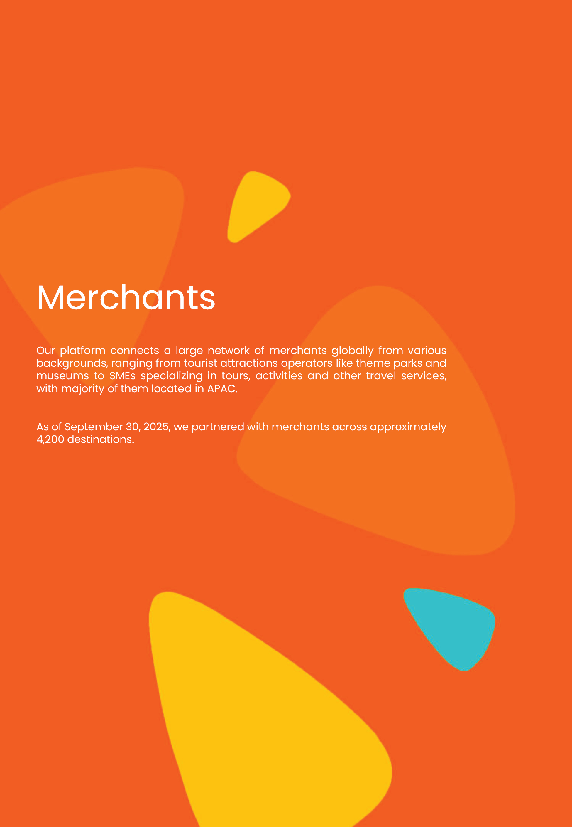 business areas. This structure allows us to be considered the primary beneficiary of the VIEs for accounting purposes, which serves the purpose of consolidating the financial results of the VIEs in our consolidated financial statements under IFRS. For a summary of these contractual arrangements, see “Corporate History and Structure — Contractual Arrangements Among the VIEs, Their Respective Shareholders and Us”. The VIEs are consolidated for accounting purposes only. These contractual arrangements are not equivalent to equity ownership, and their enforceability has not been tested in a court of law. Investors in our ADSs are purchasing equity interests in Klook Technology Limited, the Cayman Islands holding company, and are not purchasing, and may never directly hold, equity interests in the VIEs. As used in this prospectus, “we,” “us,” “our company,” “our” or “Klook” refers to Klook Technology Limited and its subsidiaries, and, in the context of describing our consolidated financial information, business operations and operating data, refers to Klook Technology Limited, its subsidiaries, the VIEs and their subsidiaries. For risks relating to our contractual arrangements with the VIEs and its respective shareholders, see “Risk Factors — Risks Related to Our Corporate Structure.” Solely in relation to our PRC business, we may face risks associated with having operations in the PRC and the evolving laws and regulations of the PRC. For a detailed description of these risks, please refer to the risks disclosed under “Risk Factors — Risks Related to Doing Business in the Geographic Markets in Which We Operate.”