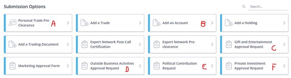 Supervised Persons can submit pre-clearance requests at https://www.mycomplianceoffice.com. Please note the corresponding submission option in MyComplianceOfffice with the pre-clearance requests listed below: